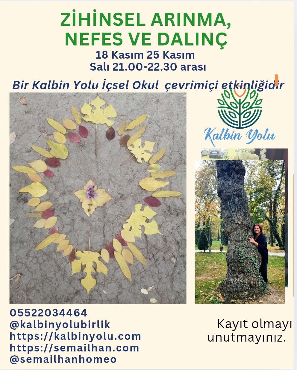 ZİHİNSEL ARINMA konusunda yapacağımız çalışmalarda düşünce, hayal gücü, vizyon, rüya, mistik odaklanma konularını işleyecek ve NEFES – DALINÇ uygulamaları ile arınma ve dönüşümü yaratabilecek araçlar edineceğiz.